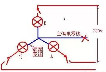 如上圖三相供電的線(xiàn)電壓為380v,但每一個(gè)家庭在主供電零線(xiàn)完好時(shí),ABC用戶(hù)都是電壓220v,一旦主供電零線(xiàn)斷開(kāi),實(shí)際用電的ABC三相用戶(hù)負(fù)載不可能相同,負(fù)載電阻大的那一相用戶(hù),得到電壓大于220v,首先負(fù)載燒毀,假設(shè)燒毀的是C,剩下的AB相如果平衡,各自分擔(dān)190v電壓,但是如果負(fù)載不平衡,電阻高的得到電壓大,如果超過(guò)220v,又將被燒毀,這時(shí)剩下的負(fù)載電阻最小的那一相,由于沒(méi)有電流,電壓是0,使得被燒毀的那兩相家庭零線(xiàn)與火線(xiàn)電壓為380v,這時(shí)這兩相用戶(hù)只要開(kāi)電器必定被燒毀,所以出現(xiàn)電器燒毀情況,一定要等電壓正常后再開(kāi)電器。