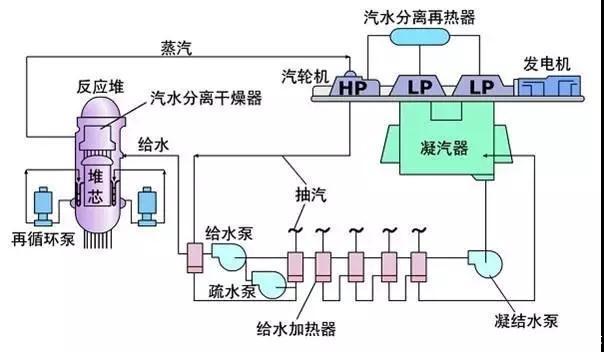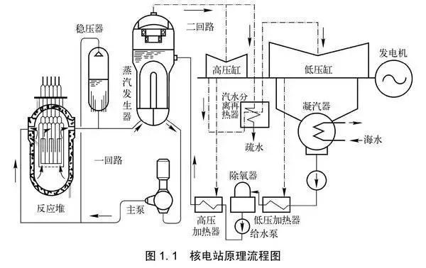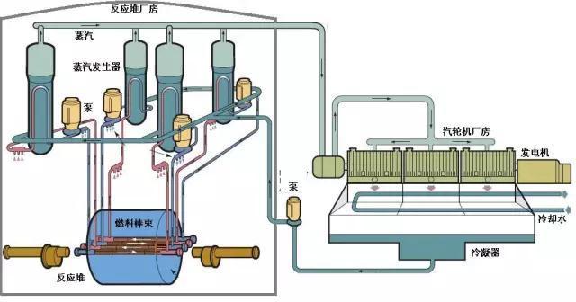 即,核能發(fā)電包括核能→熱能→機械能→電能的能量轉(zhuǎn)換全過程。其中后兩種能量轉(zhuǎn)換過程與常規(guī)火力發(fā)電廠內(nèi)的工藝過程基本相同,只是在設(shè)備的技術(shù)參數(shù)上略有不同。核反應(yīng)堆從功能上相當(dāng)于火電廠的鍋爐系統(tǒng)(火電站用鍋爐“燒水”)。但由于它是強放射源,流經(jīng)反應(yīng)堆的冷卻劑帶有一定的放射性,一般不宜直接送入汽輪機,所以壓水堆核電站比普通電廠多了一套動力回路。