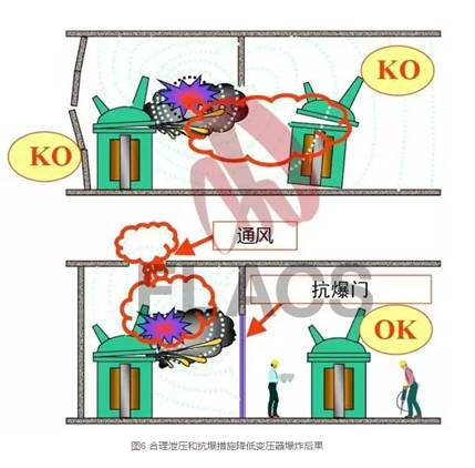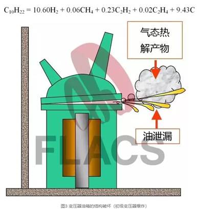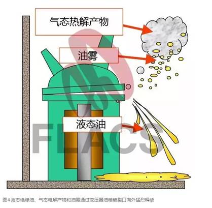 絕緣油從變壓器中泄漏并點(diǎn)燃,發(fā)生池火;氣態(tài)電解產(chǎn)物和油霧的泄漏及空氣混合,被點(diǎn)燃后發(fā)生二次爆炸。